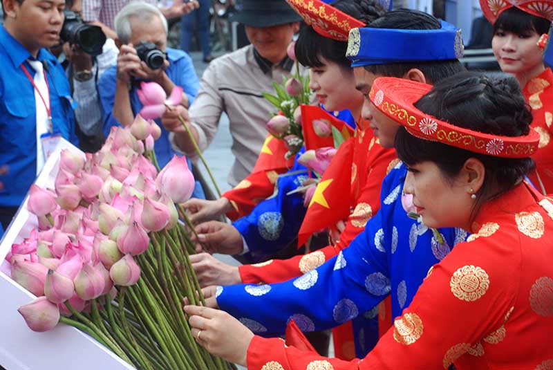 | Các cặp đôi dâng hương, hoa lên tượng đài Bác Hồ |