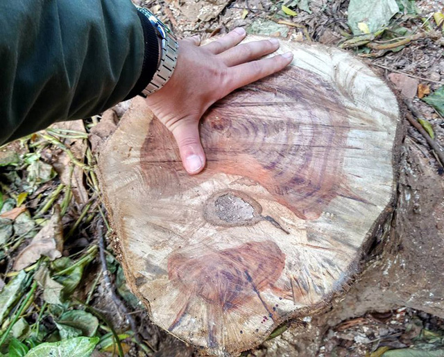 Kẻ trộm đã dùng cưa để thực hiện việc đốn hạ 2 gốc sưa lớn. 2 vườn sưa nằm cạnh lối đi của khách tham quan, các gốc sưa bị kẻ xấu dùng cưa đốn hạ sát gốc, cách mặt đất chỉ 10cm. Ảnh: GĐ&XH |