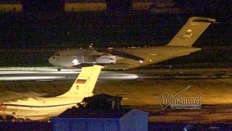 Còn chiếc C-17 là loại máy bay siêu vận tải. C-17 đến Việt Nam khá thường xuyên để thực hiện nhiệm vụ vận chuyển.
