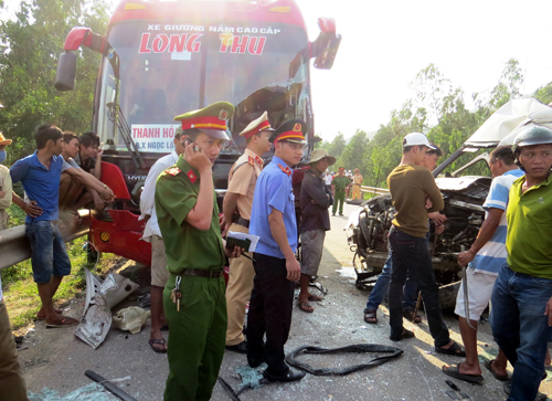 Tại hiện trường, phần đầu xe khách giường nằm bị biến dạng, phần đầu xe 24 chỗ bẹp dúm, nhiều thiết bị, kính vỡ vương vãi khắp nơi. Thời điểm xảy ra tai nạn, trên cả 2 xe chở hàng chục hành khách.