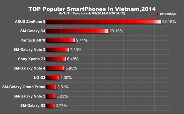 Theo đó, trang Antutu đã cho đăng tải một bài báo cáo về những mẫu smartphone Android phổ biến nhất năm 2014. Dĩ nhiên, phạm vi khảo sát là trên toàn cầu và trong Top 11 nước này, Zenfone 5 làm "bá chủ" hết 4 nước.