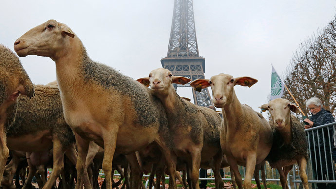 Những người nông dân Pháp hôm 27/11 đã thả khoảng 250 con cừu tại khu vực trước tháp Eiffel để phản đối Chính sách bảo vệ loài sói của chính phủ bởi chúng đang giết quá nhiều vật nuôi của họ.
