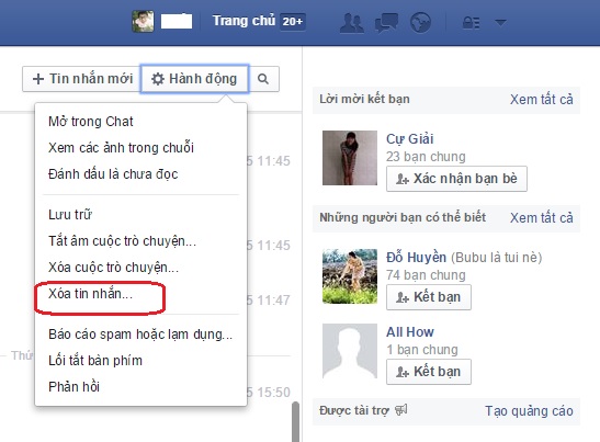 Có một số tin nhắn mà bạn không muốn cho ai biết, hãy xóa nó trước khi bị các con mắt tò mò để ý. Bạn chọn mục Messages (Tin nhắn) ở bên trái giao diện Facebook. Trên trang mở ra, bạn vào Inbox, chọn cuộc trò chuyện có các tin nhắn muốn xóa rồi nhấn menu Actions (Hành động) > chọn Delete Conversation (Xóa tin nhắn).