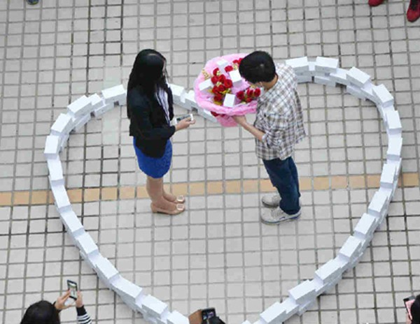 Vừa qua, hình ảnh một chàng trai tại thành phố Quảng Châu, tỉnh Quảng Đông cầu hôn người yêu bằng 99 chiếc iPhone 6s xếp thành hình trái tim nhanh chóng được lan truyền trên mạng. Để chứng minh tình yêu dành cho bạn gái, chàng trai phải “cày cuốc” chăm chỉ suốt 2 năm để có đủ số tiền hơn 500.000 NDT (khoảng 1,7 tỷ đồng) để mua những chiếc điện thoại sành điệu cho màn cầu hôn “độc nhất vô nhị”. Tuy nhiên, cô bạn gái vẫn chưa đồng ý.