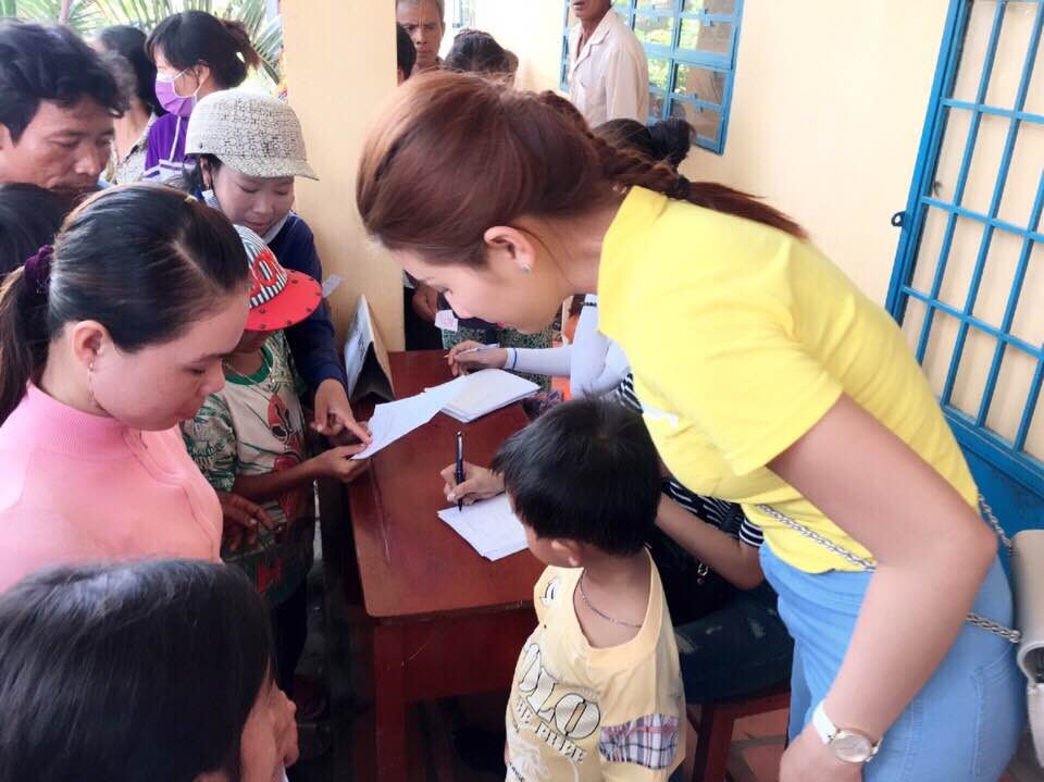 | Trong chuyến từ thiện này, Bảo Như cùng các nhà hảo tâm, các tình nguyện viên trong “San sẻ yêu thương” không chỉ tặng những món quà thiết thực như: gạo, bánh, tập vở… mà còn tổ chức khám bệnh, phát thuốc cho mọi người. |