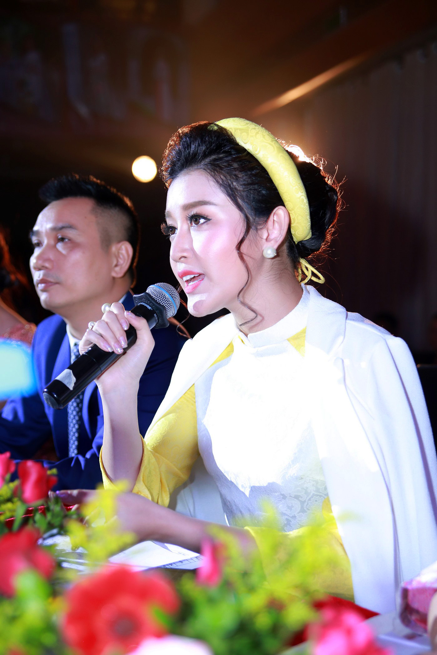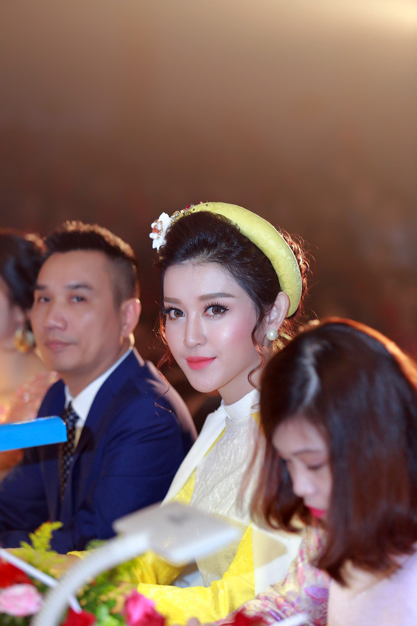 Vốn thường xuyên xuất hiện trong những bộ đầm đuôi cá lộng lẫy và quyến rũ ở các sự kiện nên diện mạo lần này của Huyền My đã gây bất ngờ cho các vị khách mời.Tà áo dài màu vàng với những hoạ tiết sặc sỡ, kết hợp cùng chiếc mấn được đính kết vô cùng tỉ mỉ và tinh xảo mang lại cho Huyền My vẻ sang trọng và kiêu kỳ. Cô kết hợp với kiểu búi tóc thanh lịch và phong cách trang điểm ngọt ngào.