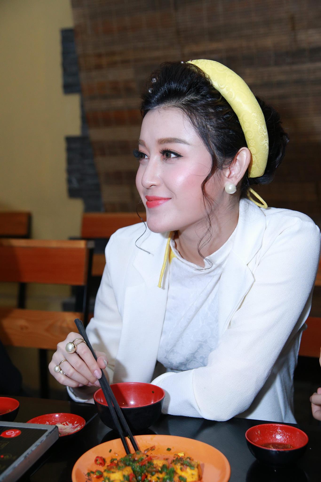 Kết thúc chương trình khá muộn vào lúc hơn 12h, Huyền My và những người bạn thân của mình đã tới một quán ăn đêm để tranh thủ nạp năng lượng sau một ngày làm việc căng thẳng và mệt mỏi. Trái ngược với vẻ đẹp kiêu sa trên ghế nóng, Huyền My giản dị ngồi ăn ở quán đêm trong bộ áo dài nhưng vẫn đủ để gây sự chú ý với những thực khách xung quanh.