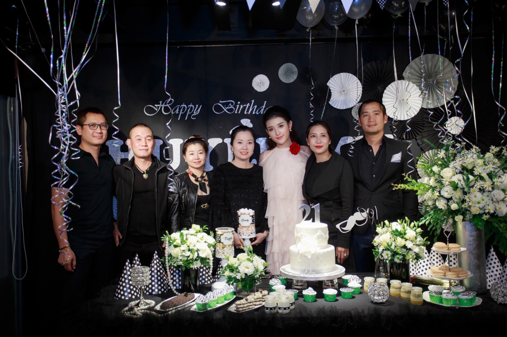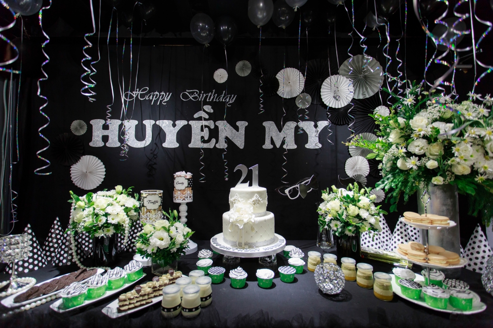 | Trước đó một ngày, Huyền My cùng gia đình, bạn bè đón sinh nhật sớm trong buổi tiệc thân mật. Không gian được trang trí phong cách hiện đại với màu đen tuyền cùng nhiều bóng bay, bánh cupcake. |
