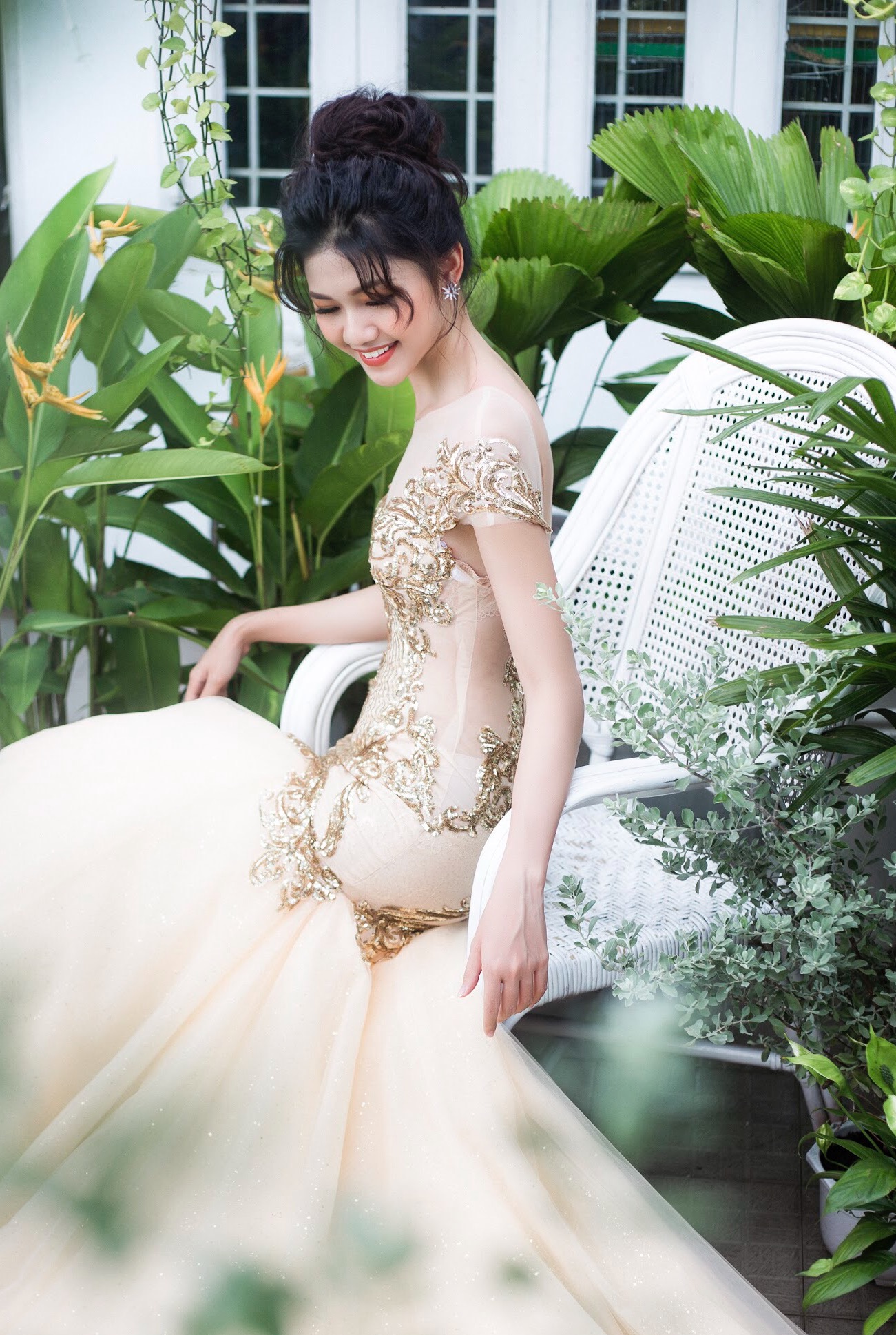 | Á hậu như một công chúa bước ra từ thế giới cổ tích, đang trong cơn say hạnh phúc khi sắp cầm tay hoàng tử trong mơ bước vào lễ đường. |