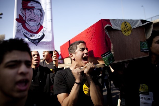 CĐV Al Ahly khiêng quan tài của những người anh em xấu số, diễu hành trên đường phố Cairo và tuyên bố trả thù Al Masry. Ảnh: AP |