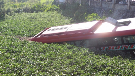 (Tinmoi.vn) Do tránh xe ô tô bất ngờ quẹo sang đường để mua xăng, chiếc xe khách đánh tay lái và cắm đầu xuống ruộng, gây thiệt hại về người và của