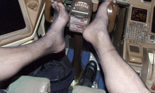 Theo Daily Mail, trong bức ảnh, phi công Colin Glover đi tất da mỏng màu đen, để lộ cả phần nhạy cảm và gác hai chân lên bàn điều khiển của buồng lái.