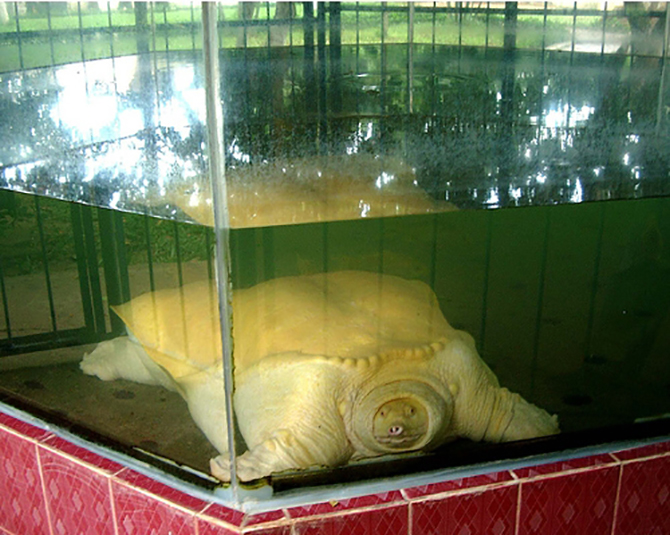 | Chú ba ba vàng được nuôi và chăm sóc trong hồ kính “bát giác”. |