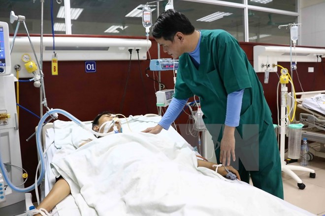 | Bác sỹ Nguyễn Văn Toại, Trưởng khoa Phẫu thuật gây mê hồi sức, Bệnh viện Đa khoa tỉnh Bắc Ninh đang thăm khám cho bệnh nhân. (Ảnh: Thanh Thương/TTXVN) |