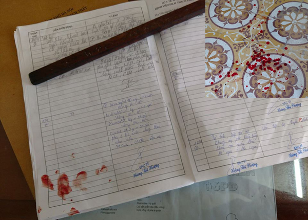| Máu vương lên hồ sơ bệnh án và nền nhà. |