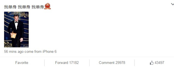 Trên bài đăng Weibo mới nhất, Hứa Ngụy Châu viết: "Tôi độc thân tôi độc thân tôi độc thân", kèm theo hình ảnh Leonardo DiCaprio lúc lên nhận giải thưởng Oscar. Ngay lập tức, bài đăng của chàng "Bạch Lạc Nhân" nhận được lượng bình luận và chia sẻ vô cùng lớn.