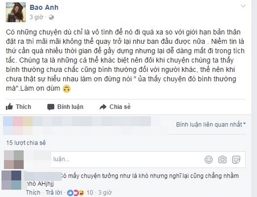 | Dòng trạng thái của Bảo Anh trên trang cá nhân. |