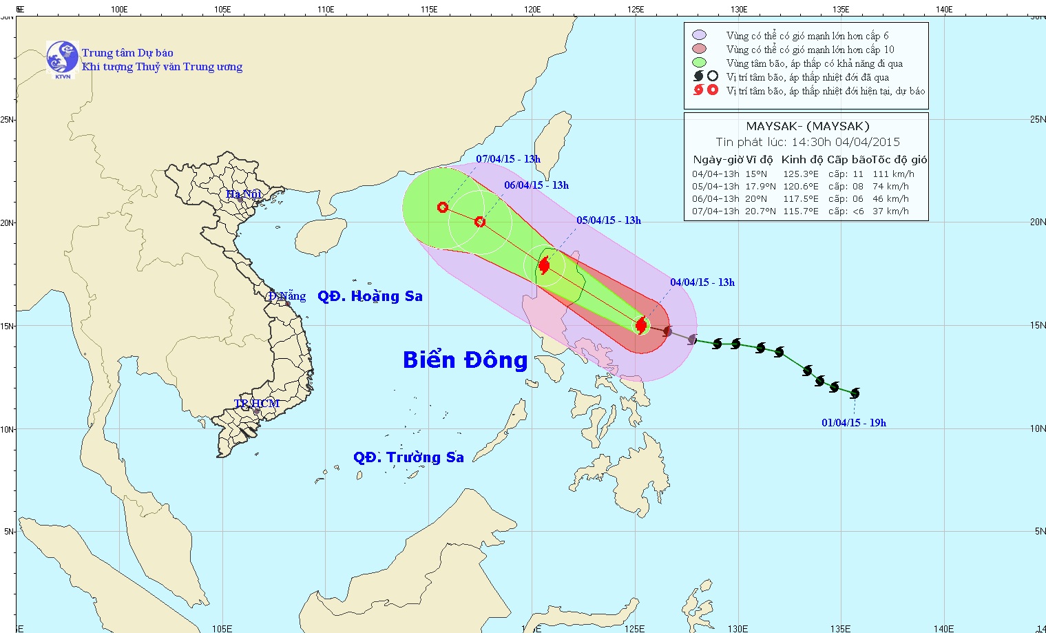Theo tin tức từ Trung tâm Khí tượng Thủy văn Trung ương, vào hồi 14 giờ ngày 04/4 vị trí tâm bão Maysak ở vào khoảng 15,1 độ Vĩ Bắc; 125,2 độ Kinh Đông, cách đảo Lu Dông (Philippin) khoảng 390km về phía Đông Đông Nam. Sức gió mạnh nhất ở vùng gần tâm bão mạnh cấp 11 (tức là từ 103 đến 117km một giờ), giật cấp 13, cấp 14.