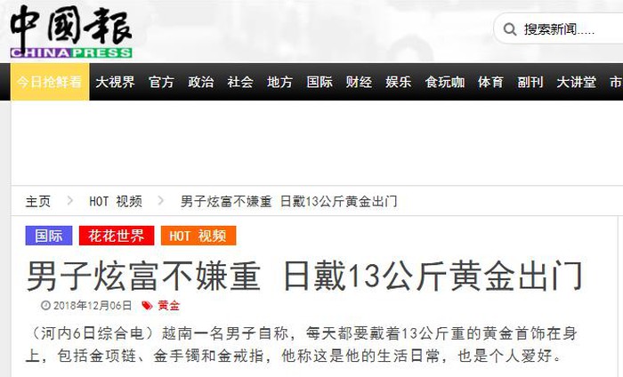 Bên cạnh đó, các tờ báo Thái Lan như Taiguo, Khaosod cũng đưa tin về đại gia Việt Nam này. Tờ Taiguo đưa tin: “Vài ngày trước, một anh chàng Việt Nam khoe mẽ sự giàu có của anh ta trên mạng xã hội. Từ hình ảnh và đoạn video được đăng tải, người đàn ông này đã đeo tổng cộng 13 kg vàng trên người bao gồm dây chuyền, nhẫn và vòng đeo tay kích cỡ khủng".