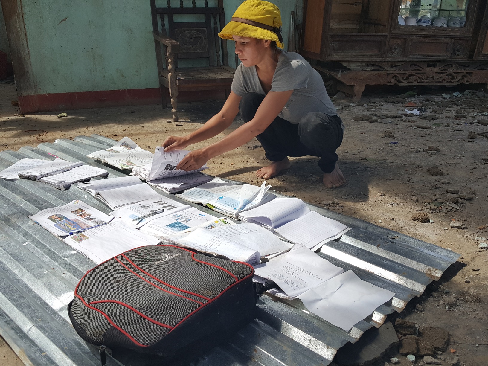 | Chị H'Ha phơi lại đống giấy tờ bị ướt do bão. |