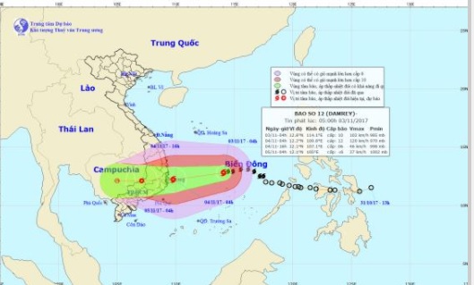Cơn bão số 12 tên quốc tế là Damrey tiếp tục mạnh lên, vị trí tâm bão cách bờ biển Khánh Hòa-Ninh Thuận khoảng 500km về phía Đông.
