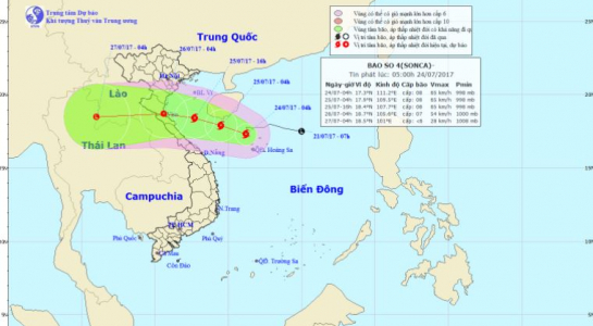 Theo thông tin từ Trung tâm dự báo khí tượng thủy văn Trung ương, vào hồi 4 giờ ngày 24/7, vị trí tâm bão ở vào khoảng 17,3 độ Vĩ Bắc; 111,2 độ Kinh Đông, cách đảo Hải Nam (Trung Quốc) khoảng 150km về phía Đông Nam. Sức gió mạnh nhất ở vùng gần tâm bão mạnh cấp 8 (60-75km/giờ), giật cấp 9-10.