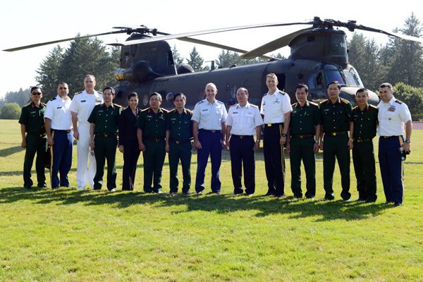 Phó đô đốc Phạm Ngọc Minh (áo trắng, giữa), phó Tổng tham mưu trưởng Quân đội Nhân dân Việt Nam kiêm phó Chủ tịch Uỷ ban quốc gia tìm kiếm - cứu nạn cứu hộ, cùng đoàn đại biểu Việt Nam chụp ảnh chung với các lãnh đạo Vệ binh Quốc gia bang Oregon, Mỹ hôm 25/8/2014 tại Warrenton, bang Oregon