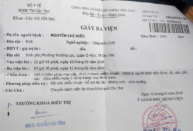 Giấy ra viện của anh Hiếu, bác sĩ ở Bệnh viện Đa khoa Trung ương chẩn đoán: Viêm phúc mạc cấp, sốc nhiễm khuẩn, bị người khác đập đánh, đá, vặn, cắn, cào, hậu phẫu ngày 2 vỡ tá tràng, suy đa cơ quan. Đến 3h20’ sáng ngày 13/8, Hiếu tử vong.