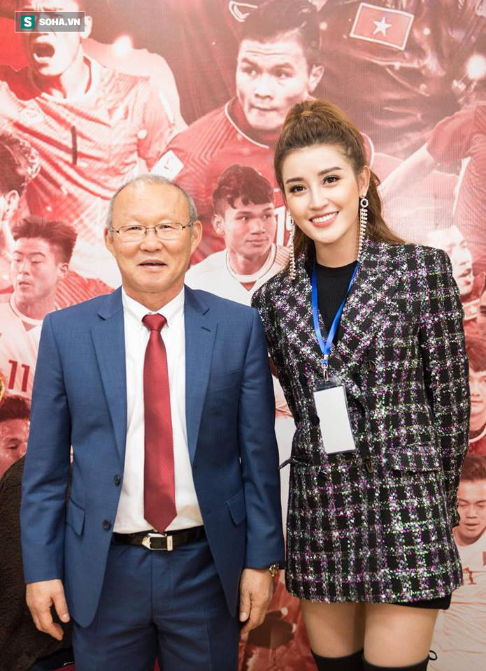 | Nàng Á hậu xinh đẹp trong một sự kiện cùng HLV Park Hang-seo và dàn cầu thủ tài năng của Việt Nam. |