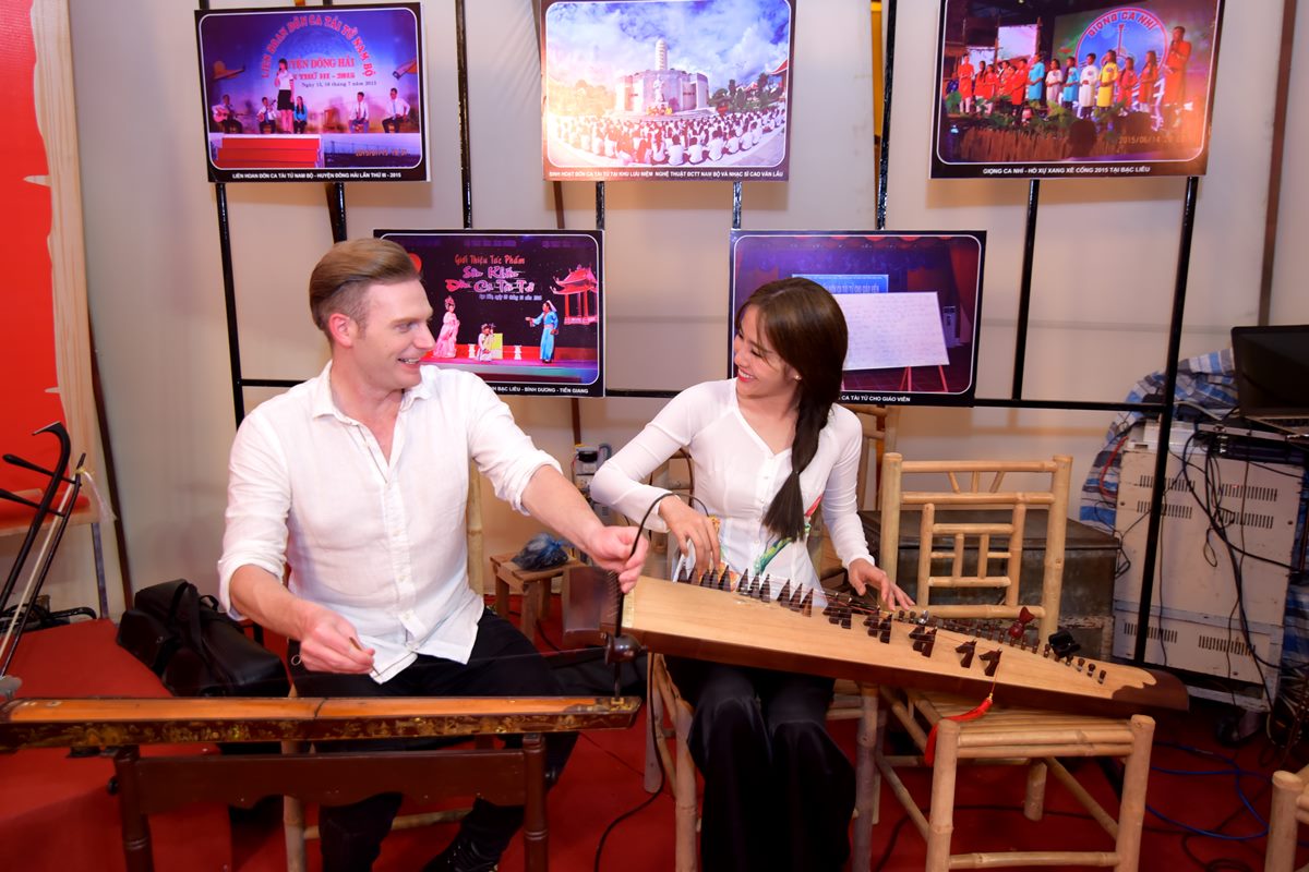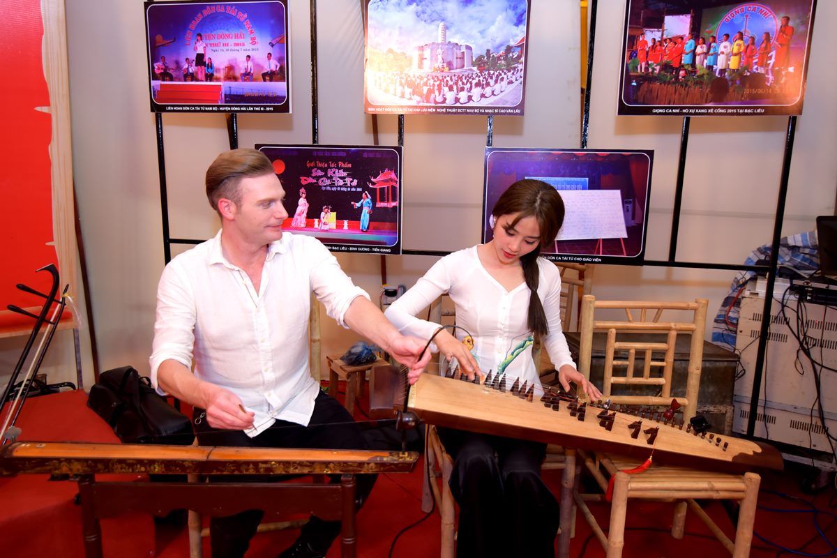 | Nam Em và Kyo York đã thử hóa thân thành những tài tử đờn, tài tử ca. Chàng nghệ sĩ Tây Kyo York dường như rất hào hứng khi được chơi các loại nhạc cụ truyền thống của Nam Bộ. |