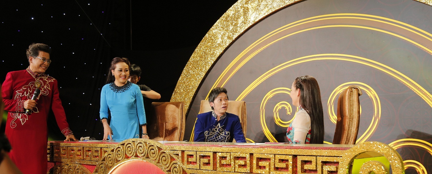 | Hoài Linh đánh mất sự chỉn chu thường thấy trên ghế nóng khi quên gài cổ áo. |