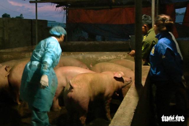 | Cán bộ thú y lấy mẫu từ heo đã bơm nước mang đi phân tích. Ảnh: Tuổi Trẻ |