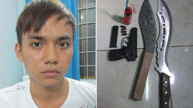 Lê Minh Quang và các hung khí bị Công an TP Vũng Tàu thu giữ - Ảnh: Báo Tuổi Trẻ