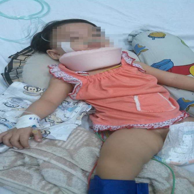 Chiều tối cùng ngày, PV nhanh chóng có mặt tại khoa Nội thần kinh của bệnh viện Nhi đồng 2 để tìm hiểu thông tin. Hiện, bé Hằng đã được cấp cứu hơn năm ngày, nhưng sức khỏe vẫn đang trong tình trạng lúc tỉnh, lúc mê, cổ phải băng bó để nắn lại xương.