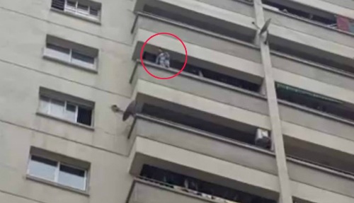 | Bé trai vắt vẻo trên lan can tầng 12 gọi mẹ. |