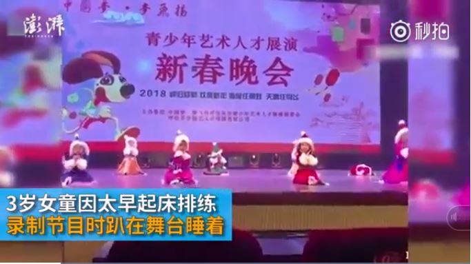 Chiều ngày 6/1, tại buổi ghi hình show liên hoan mừng xuân của một trường mẫu giáo thành phố Hulunbuir, khu tự trị Nội Mông Cổ, Trung Quốc, khi đang trình diễn tiết mục múa trong trang phục truyền thống thì có một bé gái đã bất ngờ ngủ ngay trên sàn diễn.