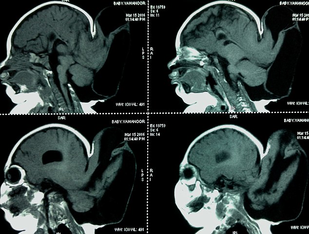 Daily Mail đưa tin cho biết bé Yamanoor Naranal (5 tháng tuổi) được chuẩn đoán mắc hội chứng thoát vị màng não chẩm.
