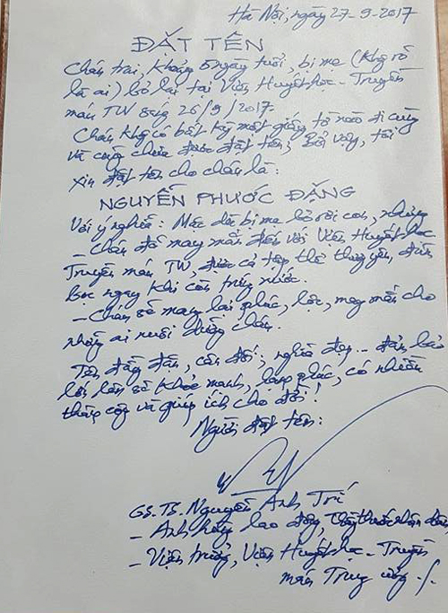 Nên đọc"Vì cháu chưa có tên, nên tôi đã xin phép tập thể viện đặt cho cháu tên là Nguyễn Phước Đặng với lời cầu mong cho cháu gặp được điều tốt lành, ai nuôi cháu cũng gặp hạnh phúc, may mắn và cháu lớn lên khỏe mạnh, có nhiều thành công và giúp ích cho đời, cho xã hội", GS Nguyễn Anh Trí chia sẻ.