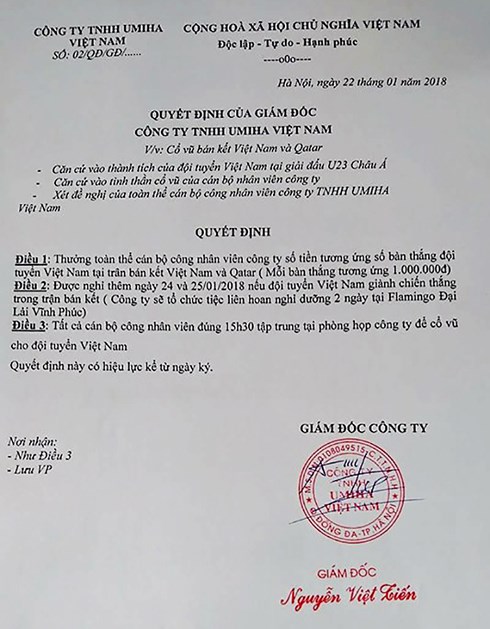 Trường hợp thứ 2 là Công ty Công ty TNHH UMIHA Việt Nam đã quyết định cho toàn thể cán bộ công nhân viên tập trung tại phòng họp công ty lúc 15h ngày 23/1 để cổ vũ cho đội tuyển U23 Việt Nam thi đấu.