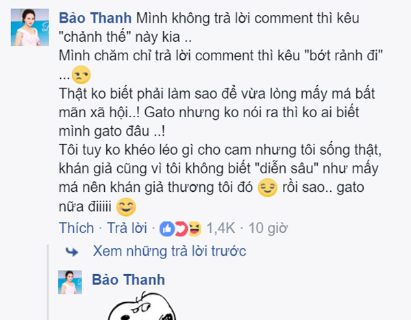 Bảo Thanh đã lên tiếng chia sẻ trên trang cá nhân:"Mình không trả lời comment thì kêu "chảnh thế" này kia… Mình chăm chỉ trả lời comment thì kêu "bớt rảnh đi"…