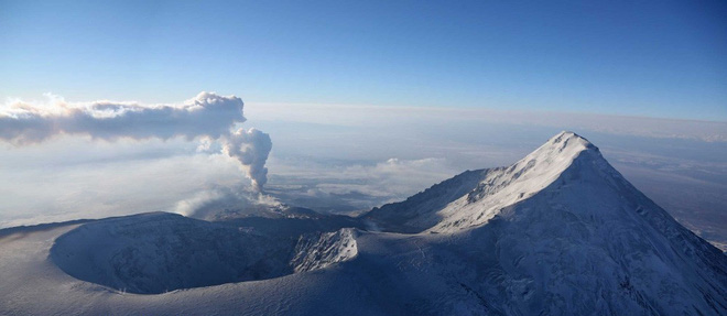| Hình ảnh cột tro bụi núi lửa trên đỉnh Plosky Tolbachik (núi lửa còn hoạt động, thuộc Tolbachik). Hình ảnh ngọn núi lửa bên cạnh, cao hơn là ngọn Ostry Tolbachik đã ngừng hoạt động. Ảnh: Internet |