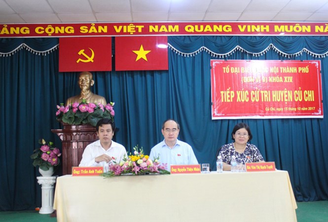 Bí thư Thành ủy Nguyễn Thiện Nhân (giữa) và tổ đại biểu Quốc hội tiếp xúc cử tri huyện Củ Chi. Ảnh: Tiền Phong |