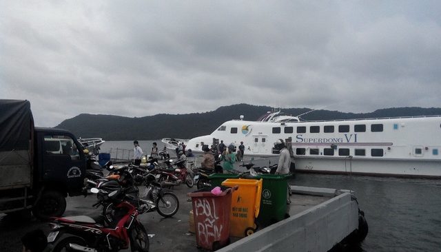 Tàu vận chuyển hành khách từ TP. Rạch Giá (thị xã Hà Tiên) ra đảo Phú Quốc và chiều ngược lại ngưng hoạt động do thời tiết. Ảnh: Dân Trí |