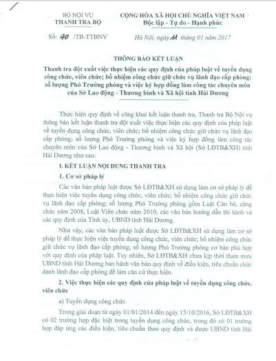 Trong Thông báo kết luận số 40/TB-TTBNV Thanh tra đột xuất việc thực hiện các quy định của pháp luật về tuyển dụng công chức, viên chức; Bổ nhiệm công chức giữ chức vụ lãnh đạo cấp phòng; số lượng phó trưởng phòng và việc ký hợp đồng làm công tác chuyên môn của Sở Lao động- Thương binh và Xã hội tỉnh Hải Dương (LĐ-TB&XH), Thanh tra Bộ Nội vụ nêu rõ: