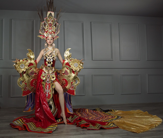 Để hoàn thiện bộ quốc phục này, nhà thiết kế và ê-kíp phải làm việc trong 3 tháng. Bộ cánh nặng 45 kg với phần đuôi cá dài hơn 3,5 m, sải cánh dài 2 m. |
