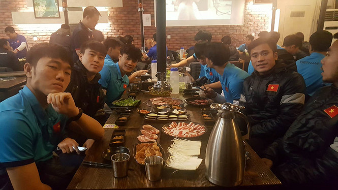 Sau một ngày hoàn toàn xả hơi và xông hơi, HLV Park Hang-seo đã quyết định khao quân bằng một bữa BBQ đúng điệu Hàn Quốc tại một nhà hàng sang trọng ở Thường Châu (Giang Tô, Trung Quốc).