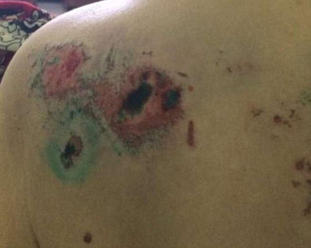| Phần lưng bầm tím và mất nhiều mảng da. Ảnh: Daily Mail |