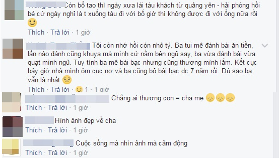 “Tôi còn nhớ, hồi còn nhỏ tí, ba tui mê đánh bài ăn tiền. Lần nào đánh cũng khuya mà mình cứ nằm bên ngủ say, ba vừa đánh bài vừa quạt mình ngủ. Tuy tính ba mê bài bạc nhưng cũng thương mình lắm. Kết cục bây giờ nhà mình ôm cục nợ và ba cũng bỏ bài bạc được 7 năm rồi. Dù sao, ba vẫn là nhất”, chia sẻ của một tài khoản Facebook có tên H.T.T.
