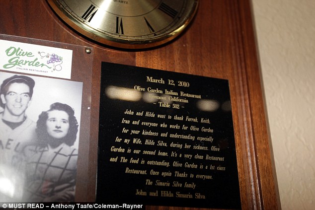 Hình ảnh của vợ chồng ông cùng câu chuyện tình yêu xúc động được trung bày tại cửa hàng Olive Garden ở Fremont