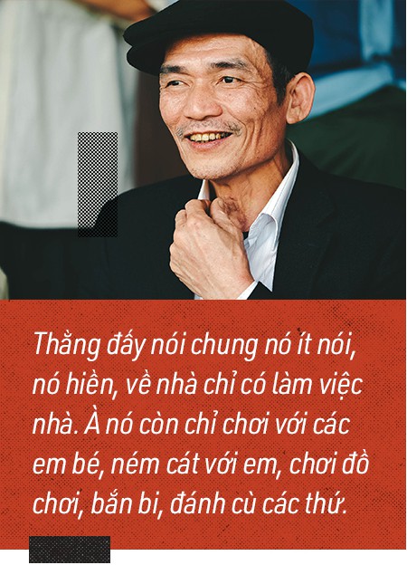 "Thằng đấy nói chung nó ít nói, nó hiền, về nhà chỉ có làm việc nhà. À nó còn chỉ chơi với các em bé, ném cát với em, chơi đồ chơi, bắn bi, đánh cù các thứ".